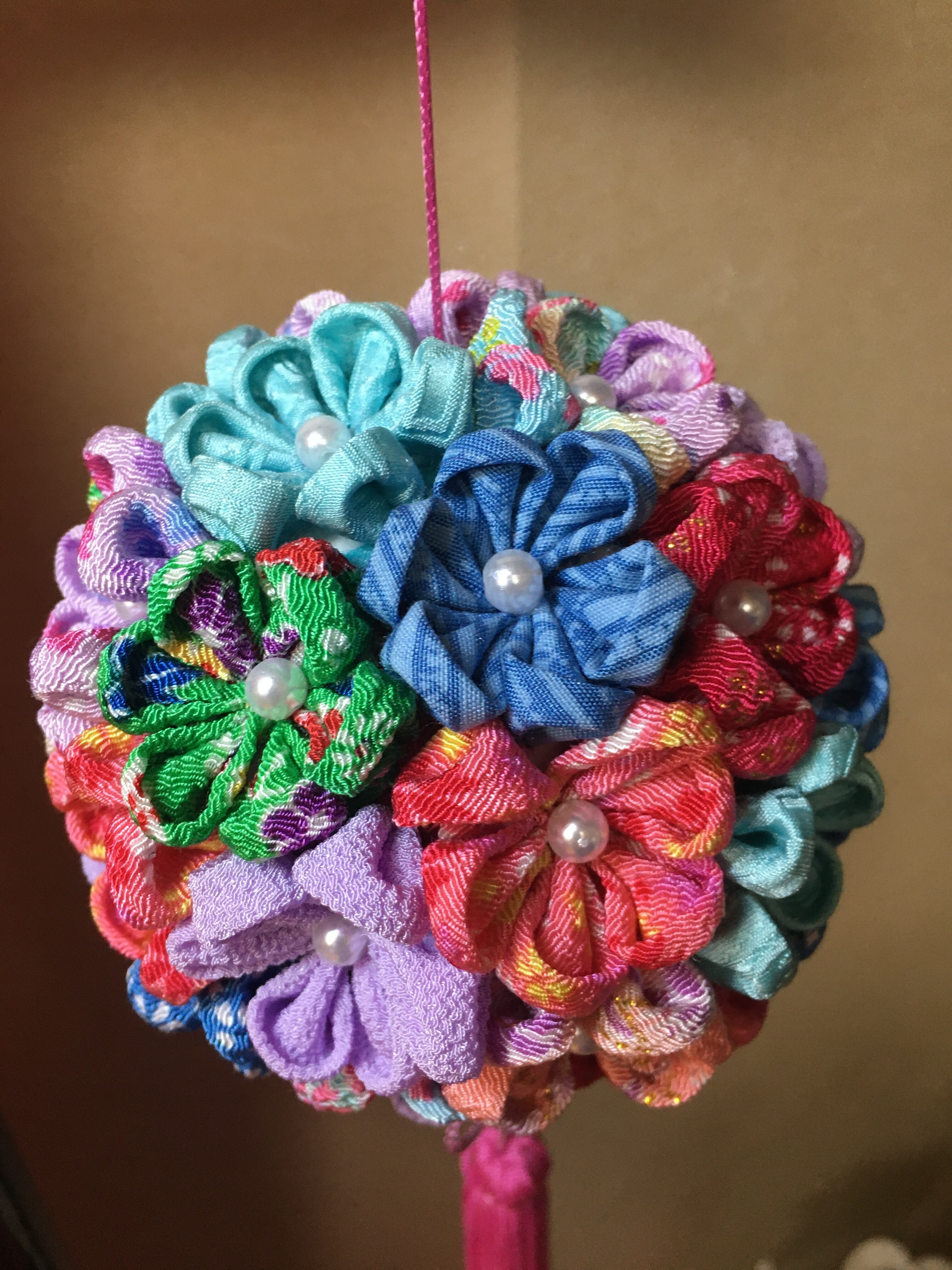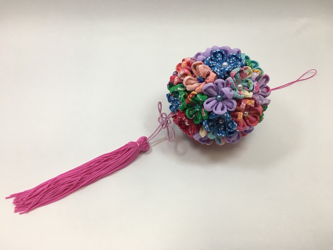 こちらの華テマリは凪砂ちゃんによって一つ一つ丁寧に作られた作品です。タッセルも彼女が色を選び、製作しました。凪砂さんは生まれつき自閉症という障害を持っていますが、持ち前の手の器用さと探求心で日々和裁士になるため精進しています。和裁を学ぶ中で身に着けた技術や彼女の感性を生かして制作した一点物の作品をお手元に取り、彼女の繊細な手仕事をお楽しみ頂けたら幸いです。