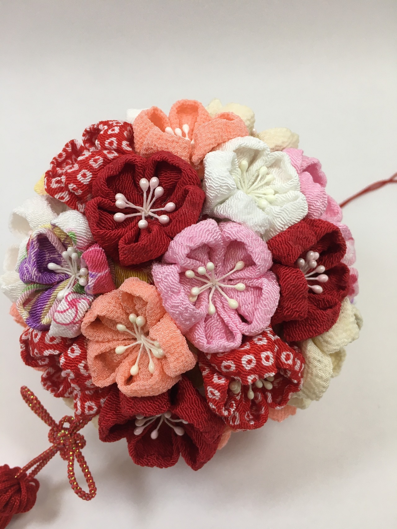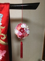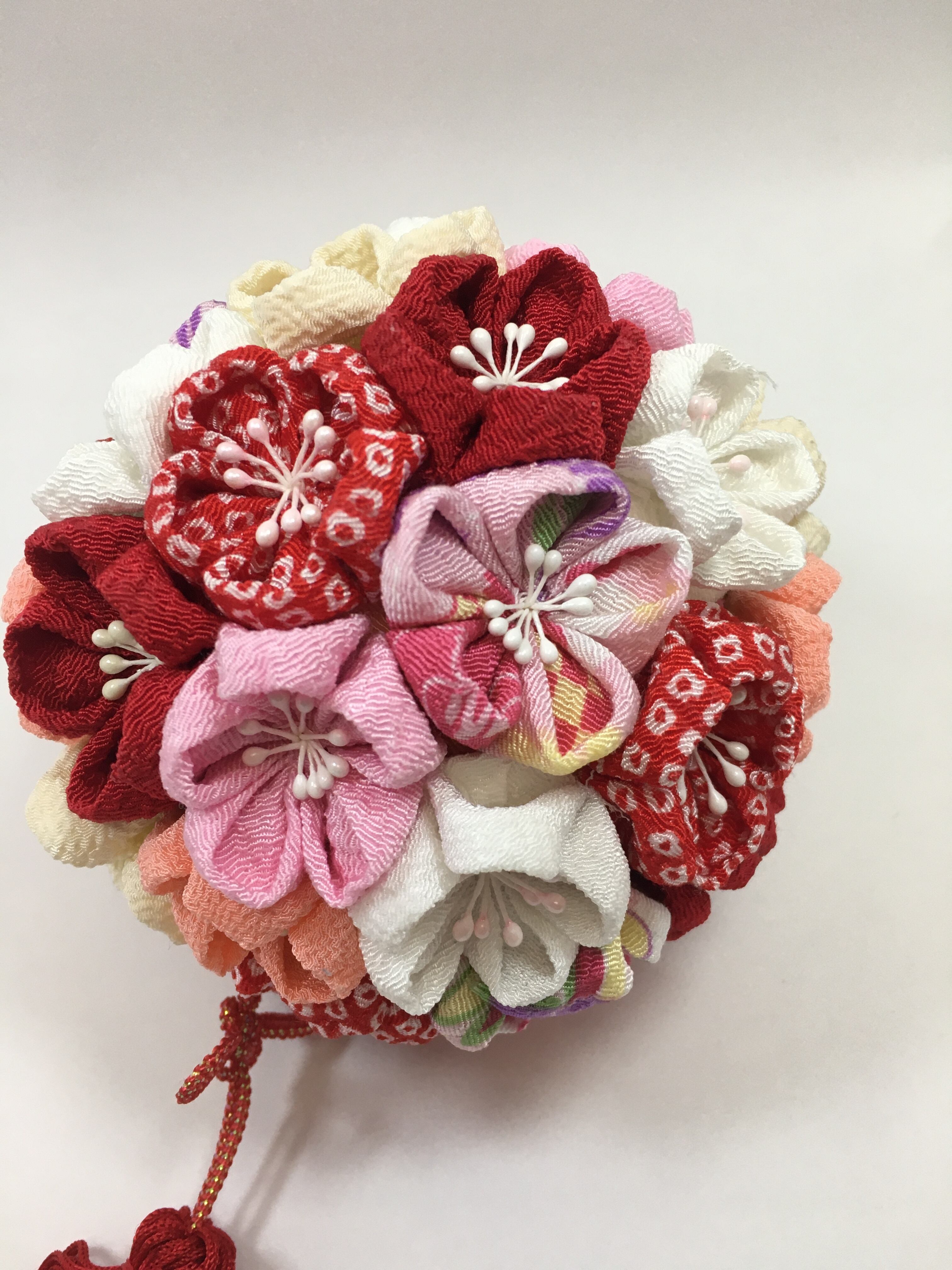 こちらの華テマリは凪砂ちゃんによって一つ一つ丁寧に作られた作品です。タッセルも彼女が色を選び、製作しました。凪砂さんは生まれつき自閉症という障害を持っていますが、持ち前の手の器用さと探求心で日々和裁士になるため精進しています。和裁を学ぶ中で身に着けた技術や彼女の感性を生かして制作した一点物の作品をお手元に取り、彼女の繊細な手仕事をお楽しみ頂けたら幸いです。