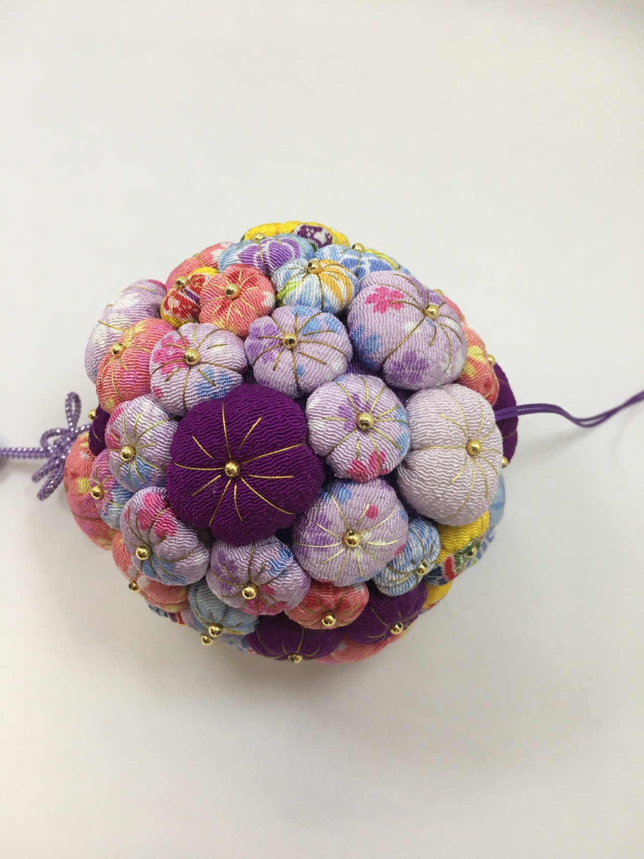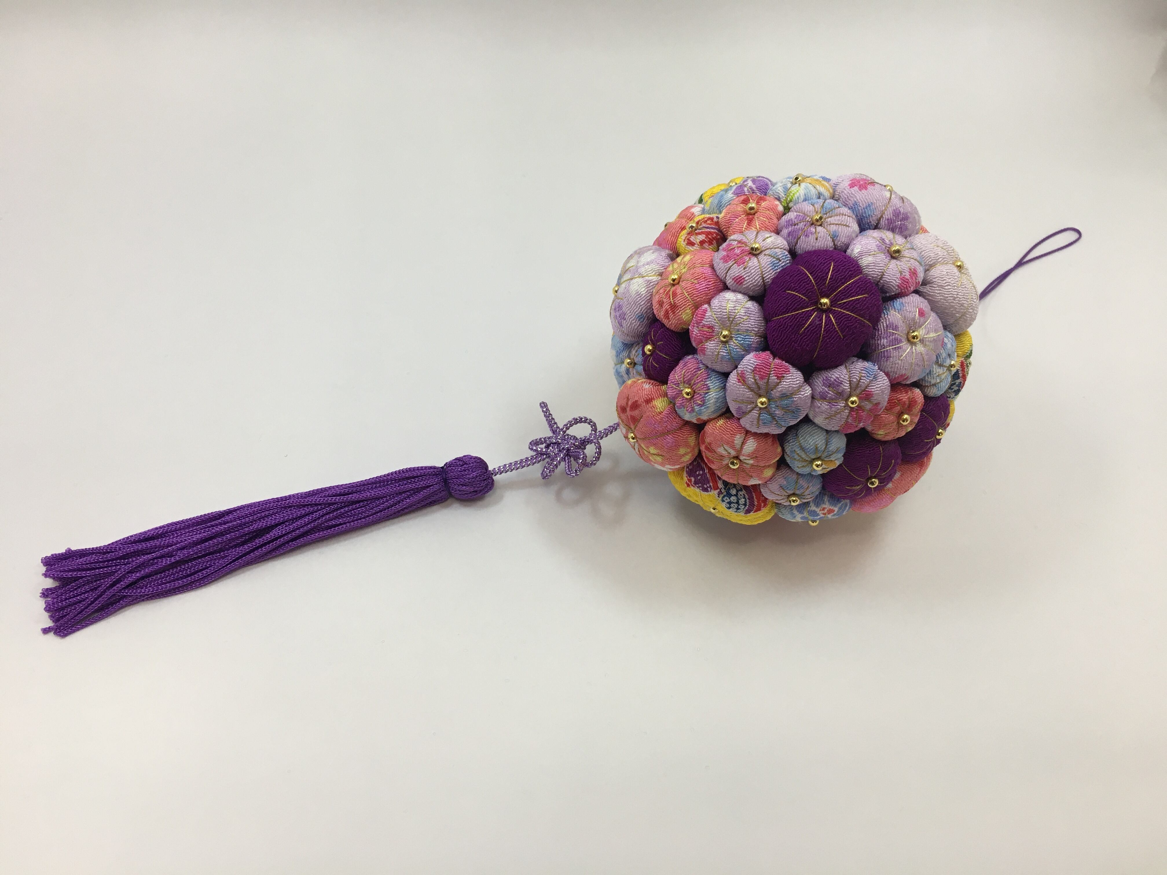 こちらの梅飾りは凪砂ちゃんによって一つ一つ丁寧に作られた作品です。タッセルも彼女が色を選び、製作しました。凪砂さんは生まれつき自閉症という障害を持っていますが、持ち前の手の器用さと探求心で日々和裁士になるため精進しています。和裁を学ぶ中で身に着けた技術や彼女の感性を生かして制作した一点物の作品をお手元に取り、彼女の繊細な手仕事をお楽しみ頂けたら幸いです。