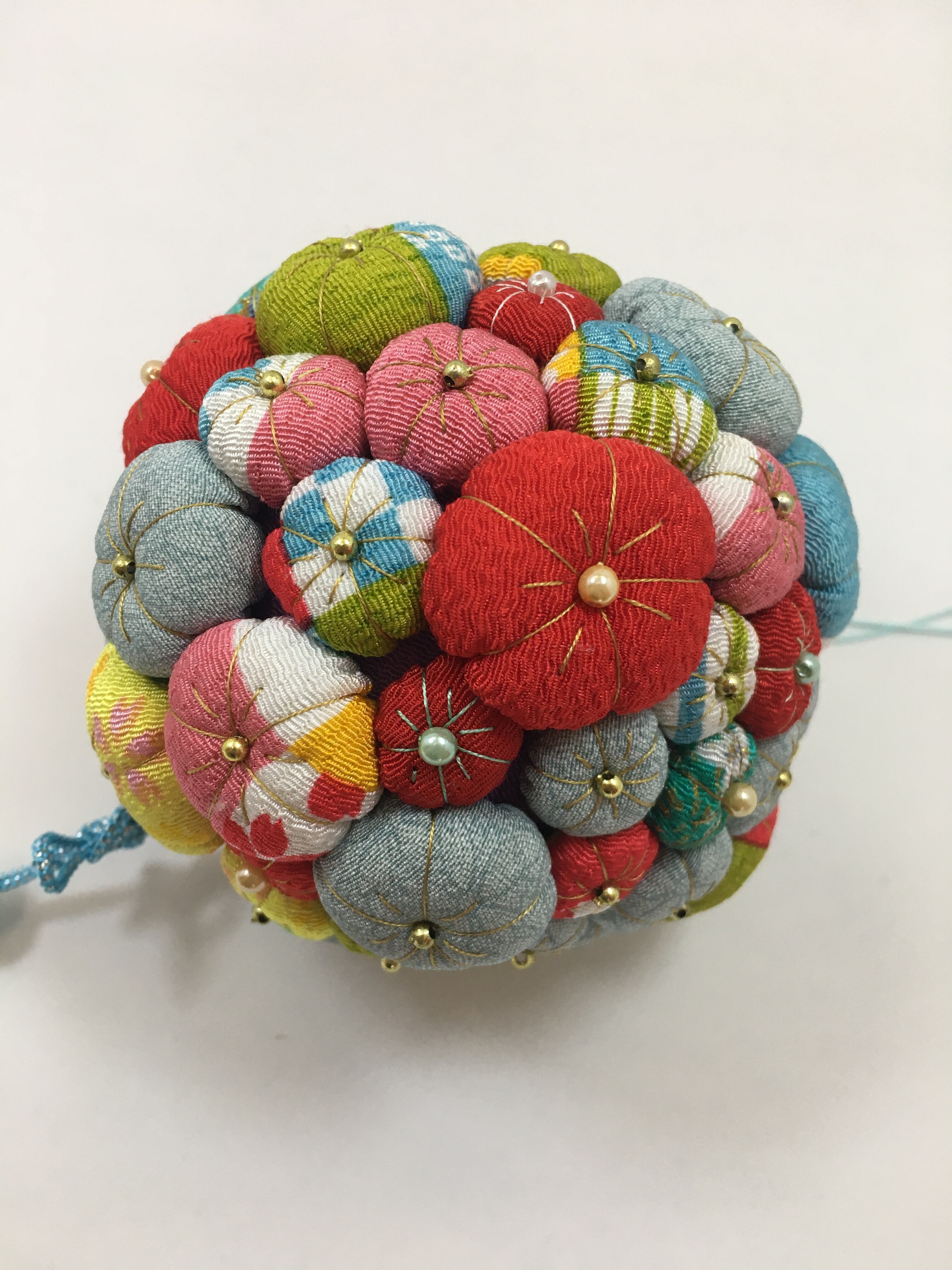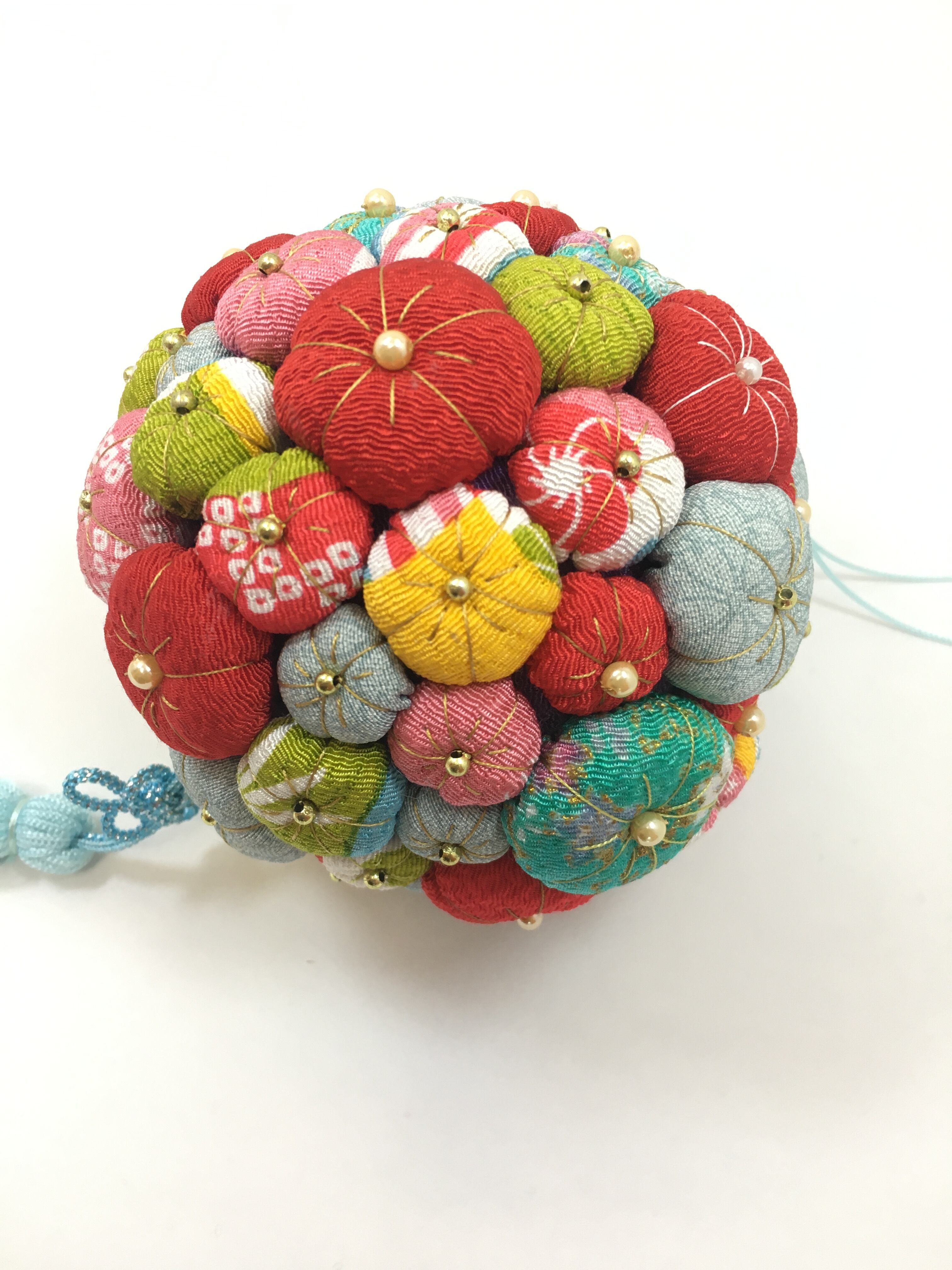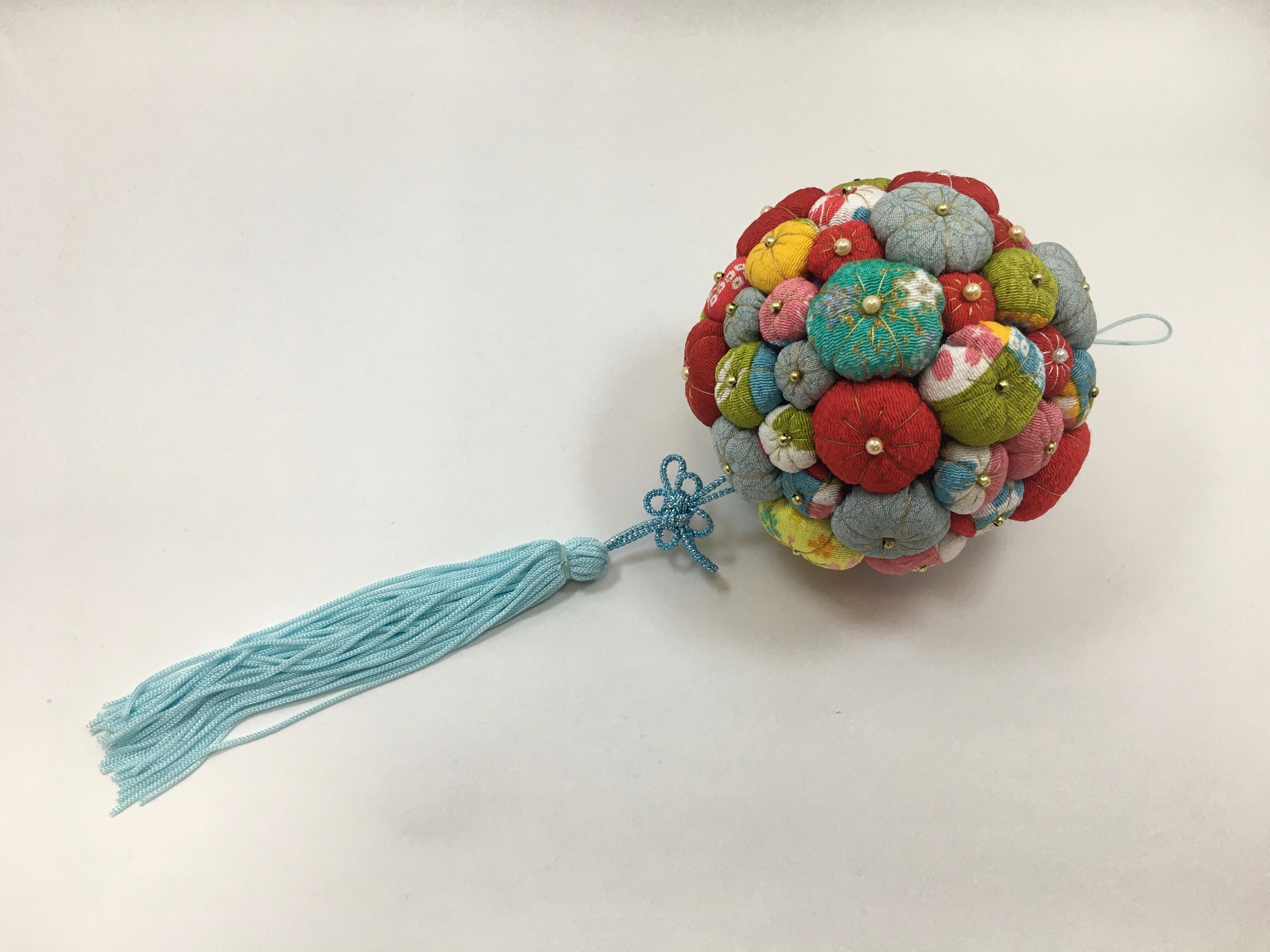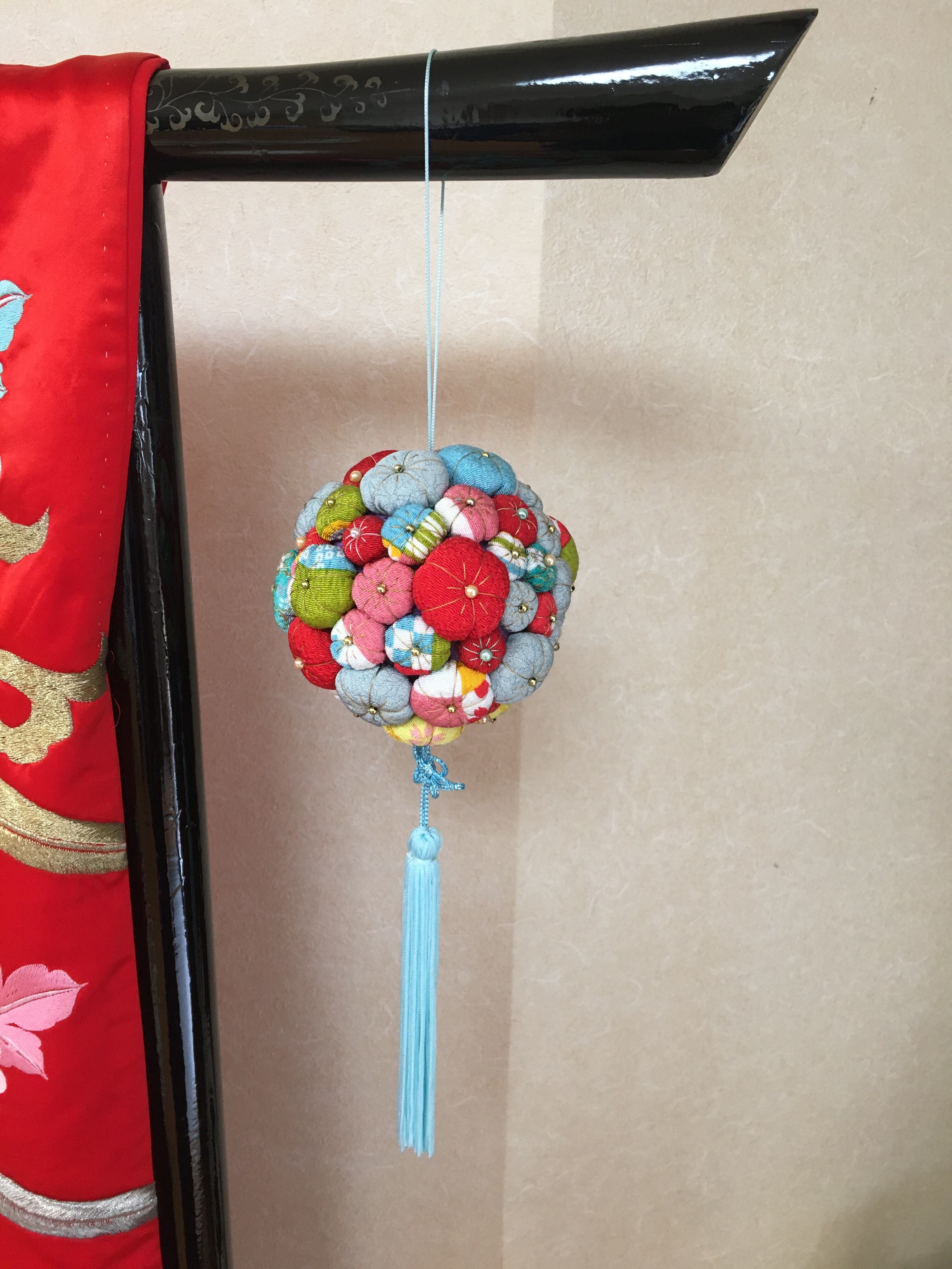 こちらの梅飾りは凪砂ちゃんによって一つ一つ丁寧に作られた作品です。タッセルも彼女が色を選び、製作しました。凪砂さんは生まれつき自閉症という障害を持っていますが、持ち前の手の器用さと探求心で日々和裁士になるため精進しています。和裁を学ぶ中で身に着けた技術や彼女の感性を生かして制作した一点物の作品をお手元に取り、彼女の繊細な手仕事をお楽しみ頂けたら幸いです。
