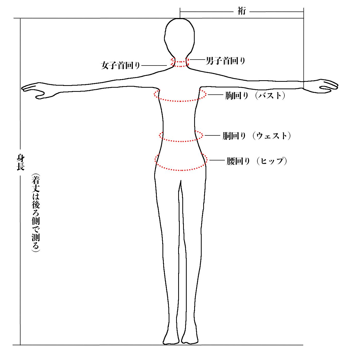 ご注文の際、裄、身長、首回り、胸回り、胴回り、腰回りのサイズを画像を参考にして、お問い合わせ欄よりお送り下さい。