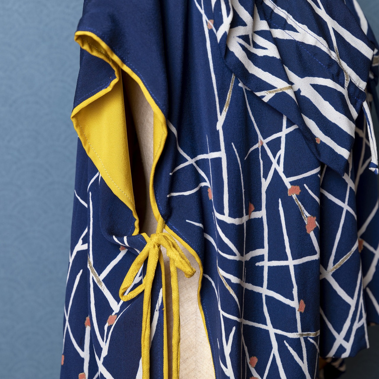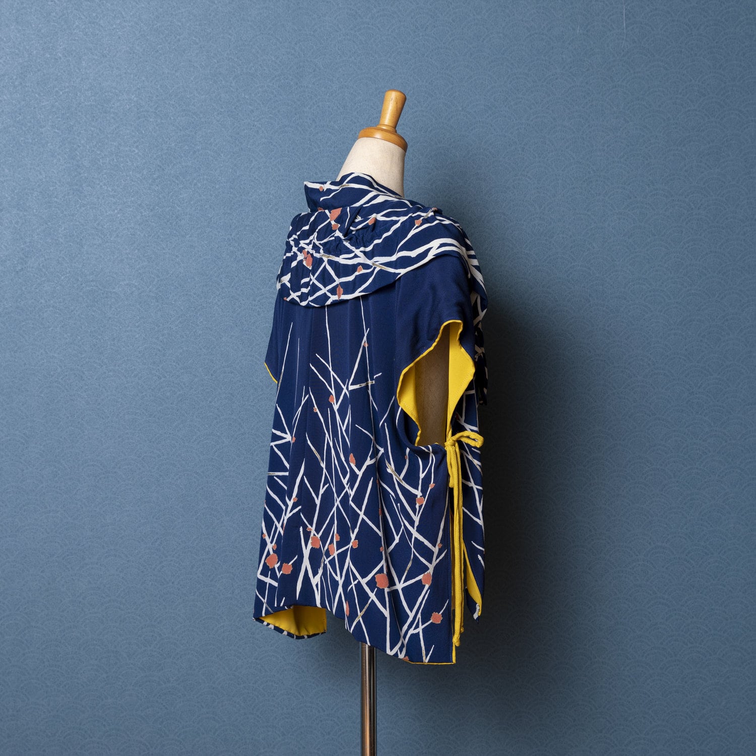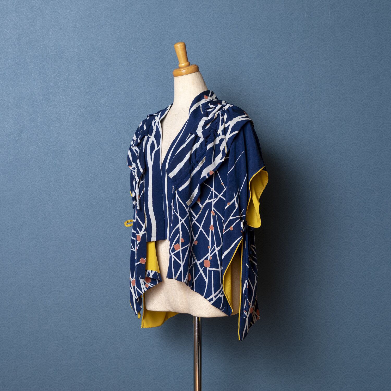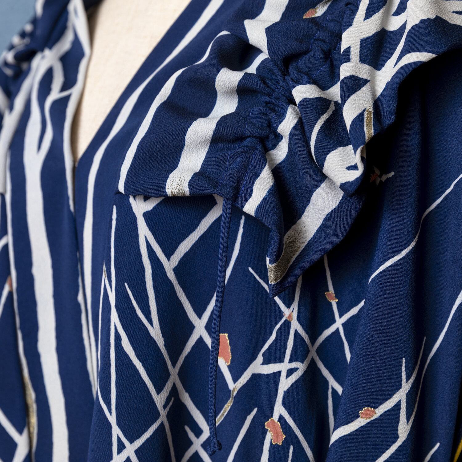 襟元はギャザーやフリルを付け、調節可能にしています。