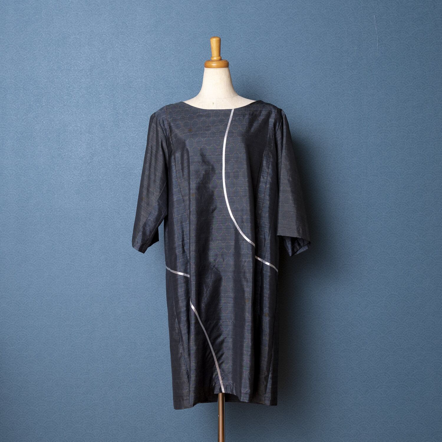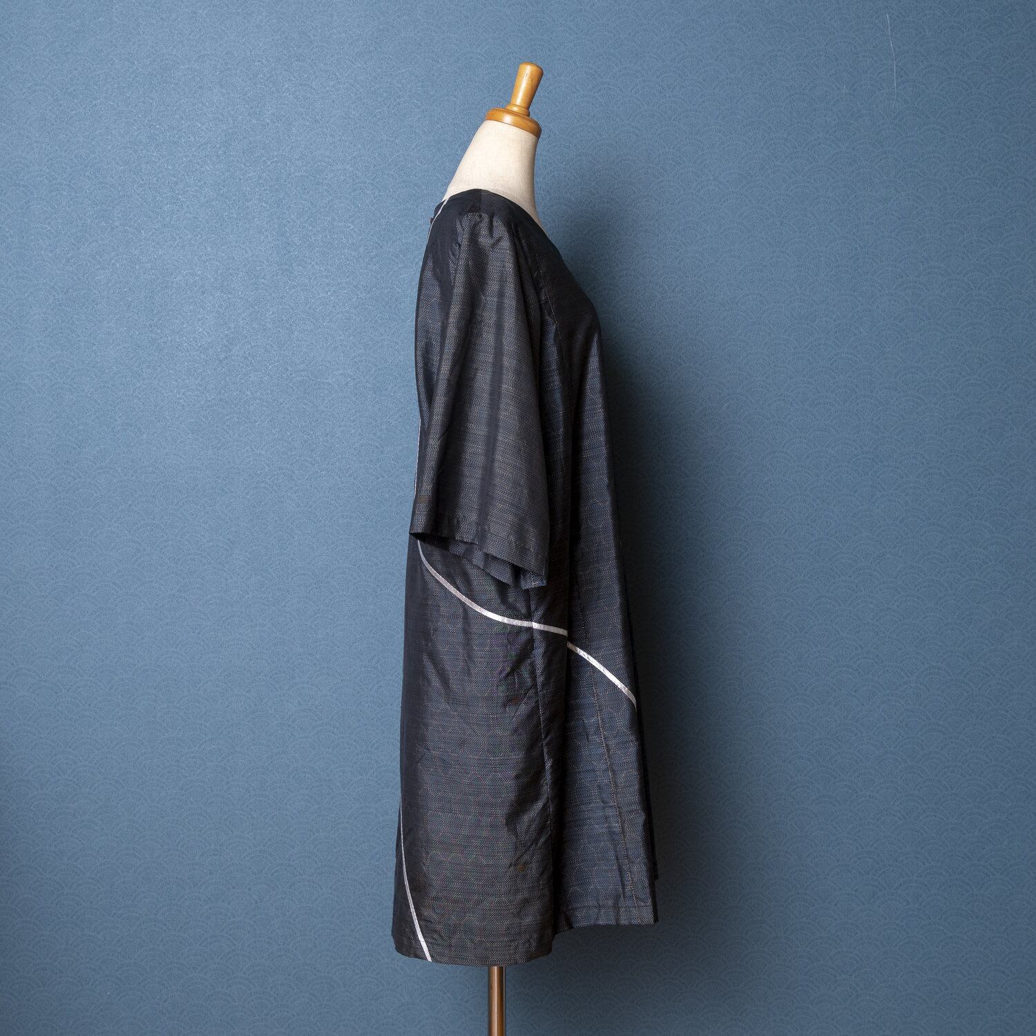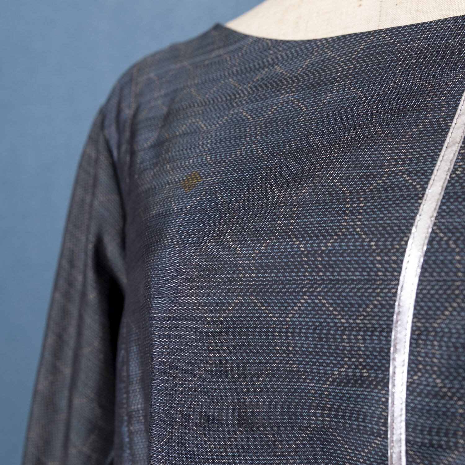 A silver ribbon sewn onto Oshima Tsumugi accentuates, the fabric.